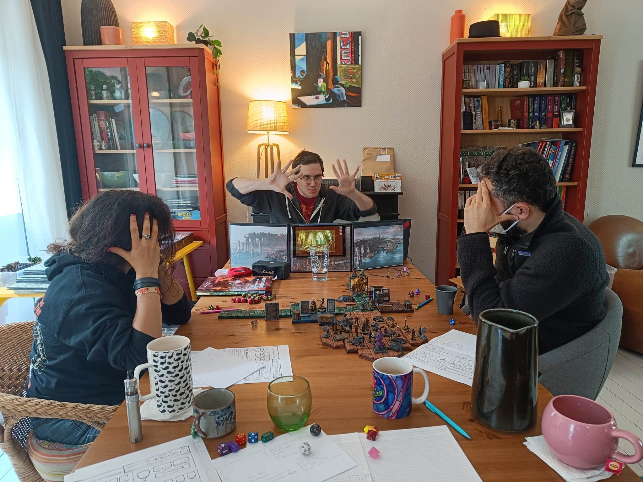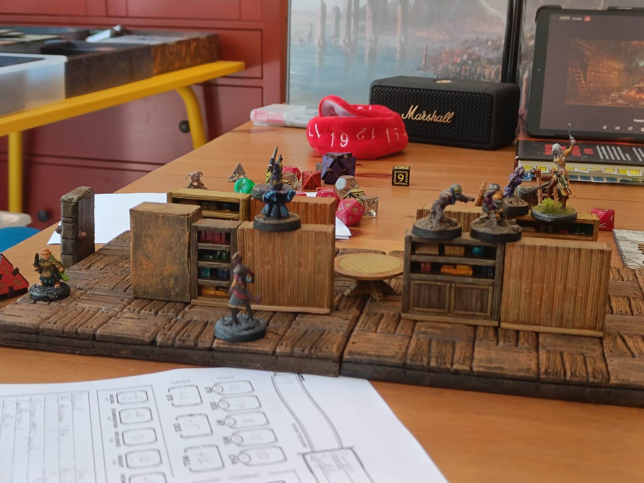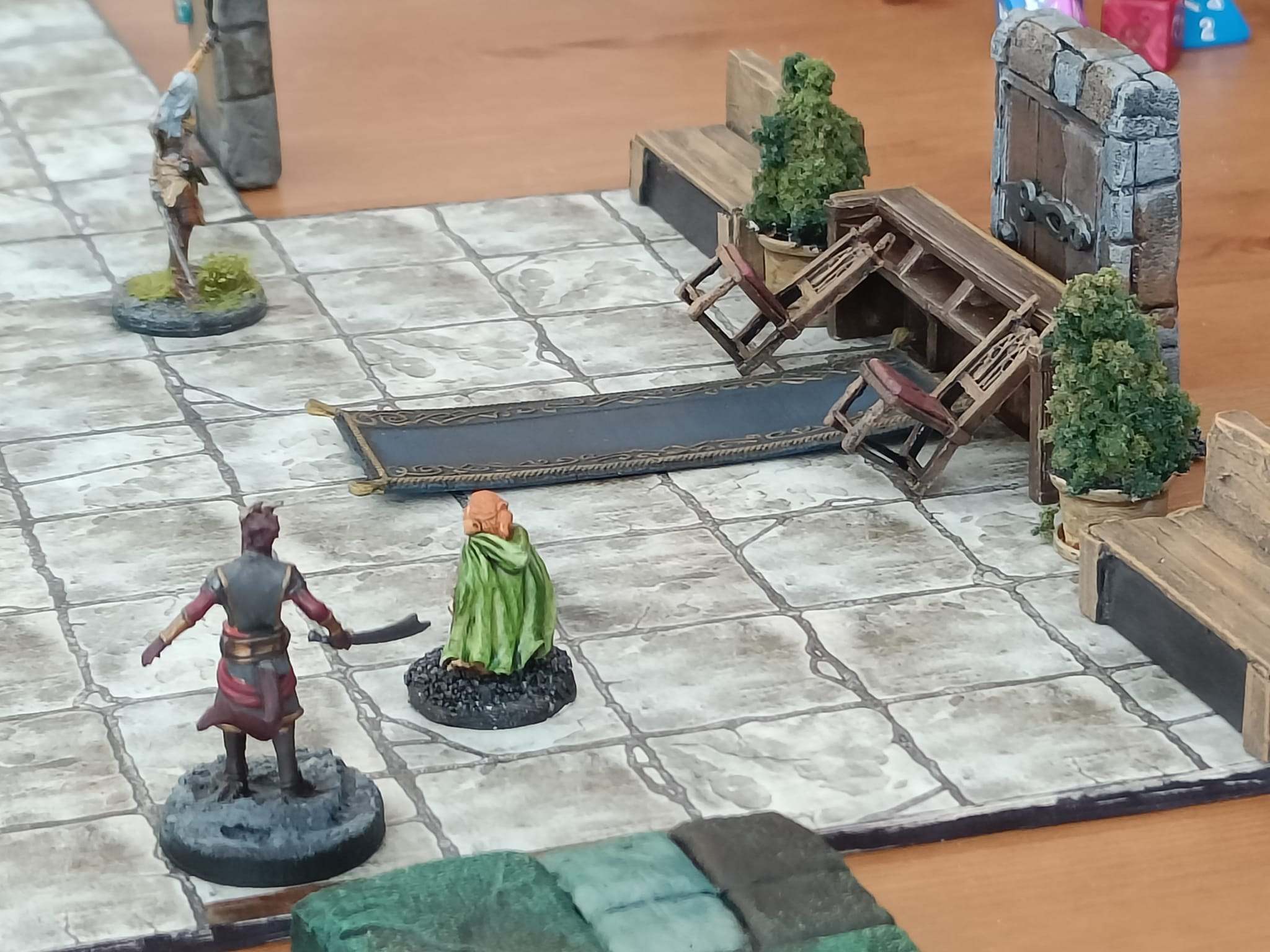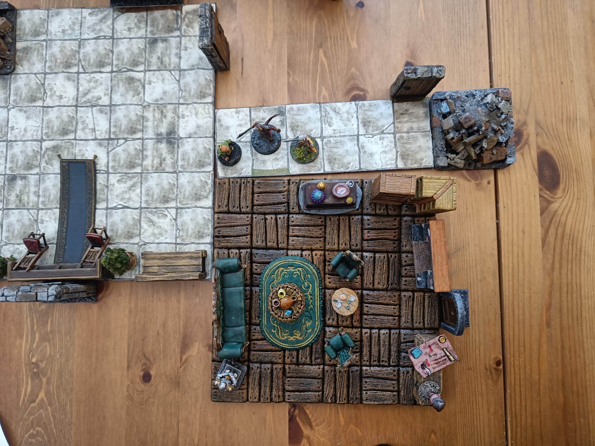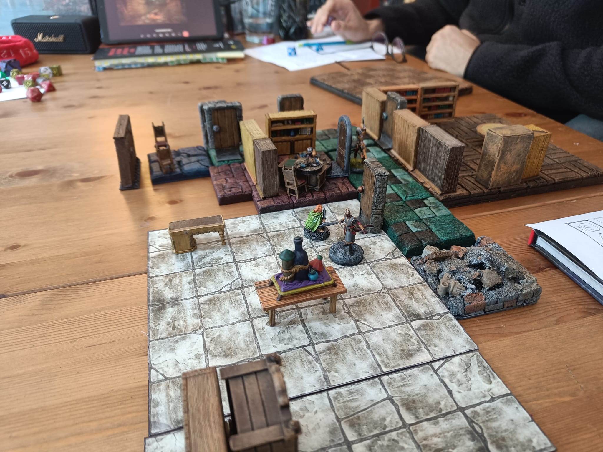 J'avais malgré tout préparé une map, décorée de plusieurs décors, et des figurines pour chaque PNJ. Cela a aidé tout le monde à s'immerger et à savoir qui est qui.