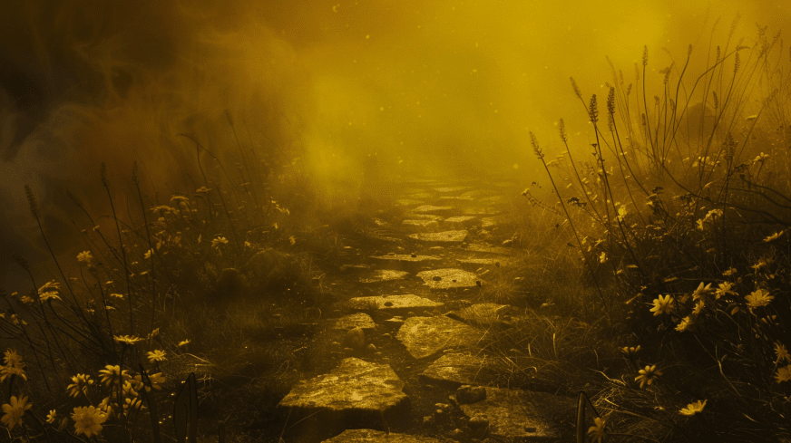 Ils sortent en file indienne dans le jardin, suivant des petites dalles plates à travers le brouillard. Les sons sont étouffés, seuls quelques bruissements de feuilles se font entendre et des silhouettes semblent se dessiner sur les côtés.