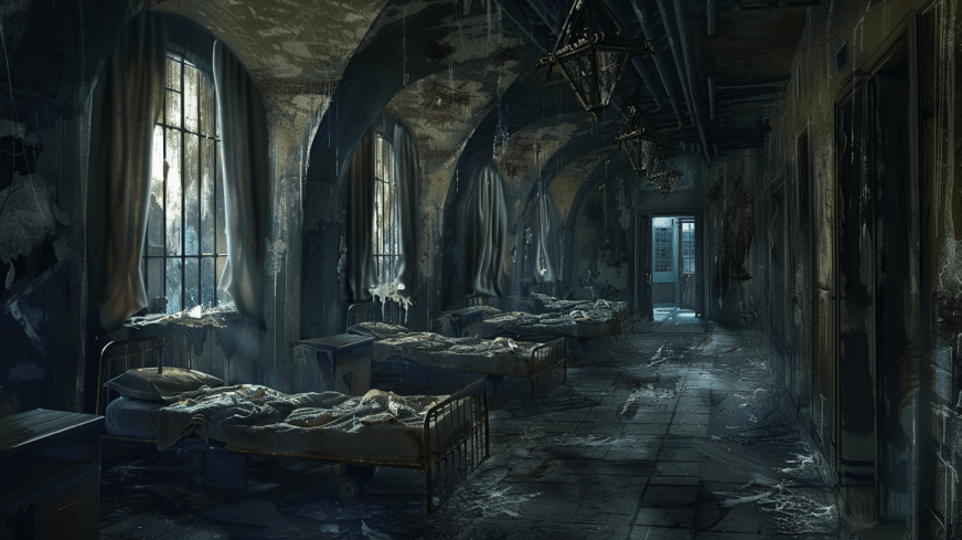À l'intérieur, des meubles brisés et des caisses retournées servent de cages improvisées. Sur l'une des caisses se trouve une goule ; un lit est posé verticalement avec un patient encore attaché dessus tandis que deux autres goules dévorent des cadavres.