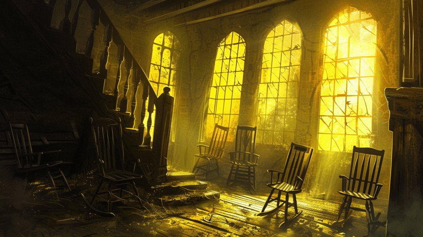 Après s'être reposés, ils sortent et atteignent la tour. La pièce est calme avec une dizaine de rocking chairs tournés vers l'extérieur. Iskil installé dans un rocking chair face au mur, ils commencent à monter un escalier branlant jusqu'au premier étage.