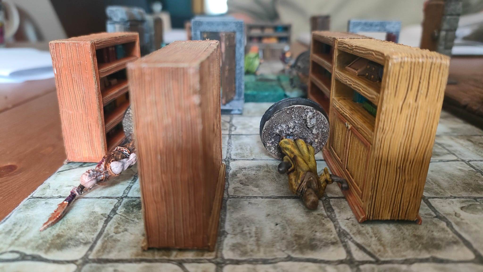 Nos joueurs engagent le combat contre deux apotres dans une salle pleine des anciennes affaires des patients, pendant qu'un troisième de l'autre côté du couloir vient en renfort. Les PJs subissent de lourds dégats (surtout quand les Apôtres ont deux attaques chacun, et potentiellement avec avantage quand ils sont deux sur la même cible, et que les PJs n'ont qu'une seule esquive possible). Les PJs sortent victorieux, mais bien amochés.